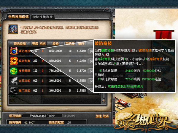 ![]() 个人技能的学习与加速 在领地学院,玩家又可以通过经验和银两的消耗学习新的技能了!新开放的领地技能将涵盖减少敌方防御、减少技能冷却时间等前期技能没有涉及的方面。例如“破防奇技”就将在攻击时忽视敌方的一定百分比的防御,而“火凤冷却”、“鬼门冷却”等技能从字面上就很好理解了。 此外,在领地书院中,个人技能的学习不仅可以加速,还可以突破升级,即当家族研发科技等级不满足玩家的需要时,玩家可以提前学习还没有达到科技等级条件的领地技能,好像在一年级学习五年级的课程一样。不过揠苗助长的代价是付出更多的领地贡献度、银两和经验。 学院的等级 领地学院满级为50级,领地大厅每提升1级,学院可提升1级,对应的建筑科技可以提升1级,对应的技能学习可以提升1级。当领地建筑等级已经升至上限时,突破升级最高可以突破升级10级。